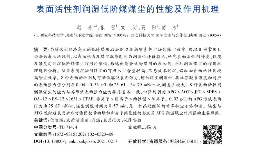 低階煤在中國儲量豐富且富含高附加值油氣資源,可以高效分質利用,為緩解我國石油資源緊張和環境污染局面提供了新的可能,逐漸成為新的關注點。近年來隨著低階煤開采量的增大,采煤機械化程度的提高,全機械化工作面上的煤塵濃度可達3 000 mg/m3,遠超國家職業衛生標準中的要求。長時間暴露于超標的煤塵環境是礦工患塵肺病的重要誘因之一。塵肺病發病率高且無法治愈,2018年,全國報告的職業性塵肺病19 468例,占到了各類職業病新病例總數的8285%,且發生率還有上升趨勢。此外,井下煤塵濃度聚集到一定程度還會引發爆炸,造成更大的人員傷亡和經濟損失。因此,有效抑制礦塵對煤礦安全生產和礦工的職業健康安全都至關重要。目前常用的措施包括通風除塵、煤層注水、噴霧灑水等,這些技術對降低作業點的粉塵濃度都起到了重要作用。低階煤的煤化程度較低、揮發分及灰分含量高、含水率高、含氧多、孔結構豐富,與其他煤種相比通常更易被潤濕,因此適用噴霧抑塵。噴灑自來水的除塵效率只有不到60%,向水中加入表面活性劑可以增加煤塵潤濕性和滲透性,提高除塵效率。化學表面活性劑的選擇受自身性質、結構、煤塵表面官能團、煤塵帶電性質等多種因素的影響,其選擇具有特異性和專一性,目前關于抑制低階煤煤塵添加劑的研究還較少。篩選出常用且經濟的表面活性劑作為添加劑提高低階煤煤塵的除塵效率具有積極意義。