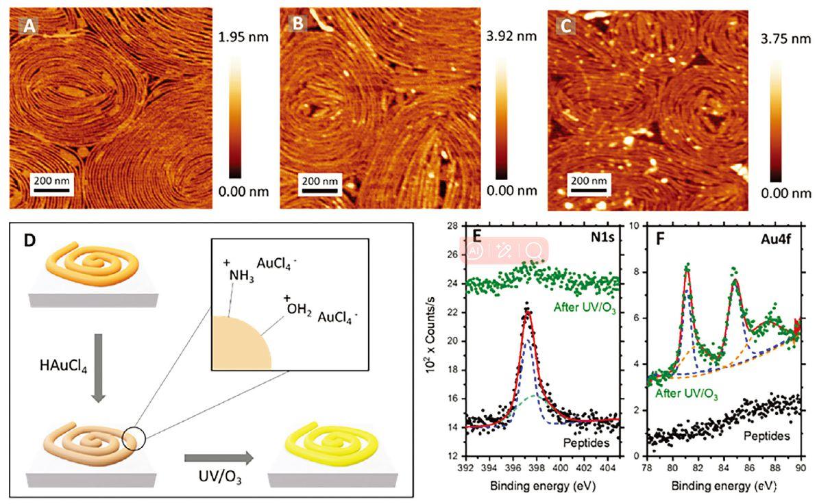 圖5、A)原始FP2肽在20 mN m-1表面壓力下在云母基底上的AFM顯微照片,B)浸入HAuCl4溶液30分鐘后的照片,以及C)在隨后的UV/O3降解處理后的照片。D)示意圖顯示了肽纖維和金前體鹽在水溶液中的相互作用。原始FP2肽的E)N 1s和F)Au 4f(黑點(diǎn))以及無機(jī)摻入和UV/O 3降解后(綠點(diǎn))的高分辨率XPS。