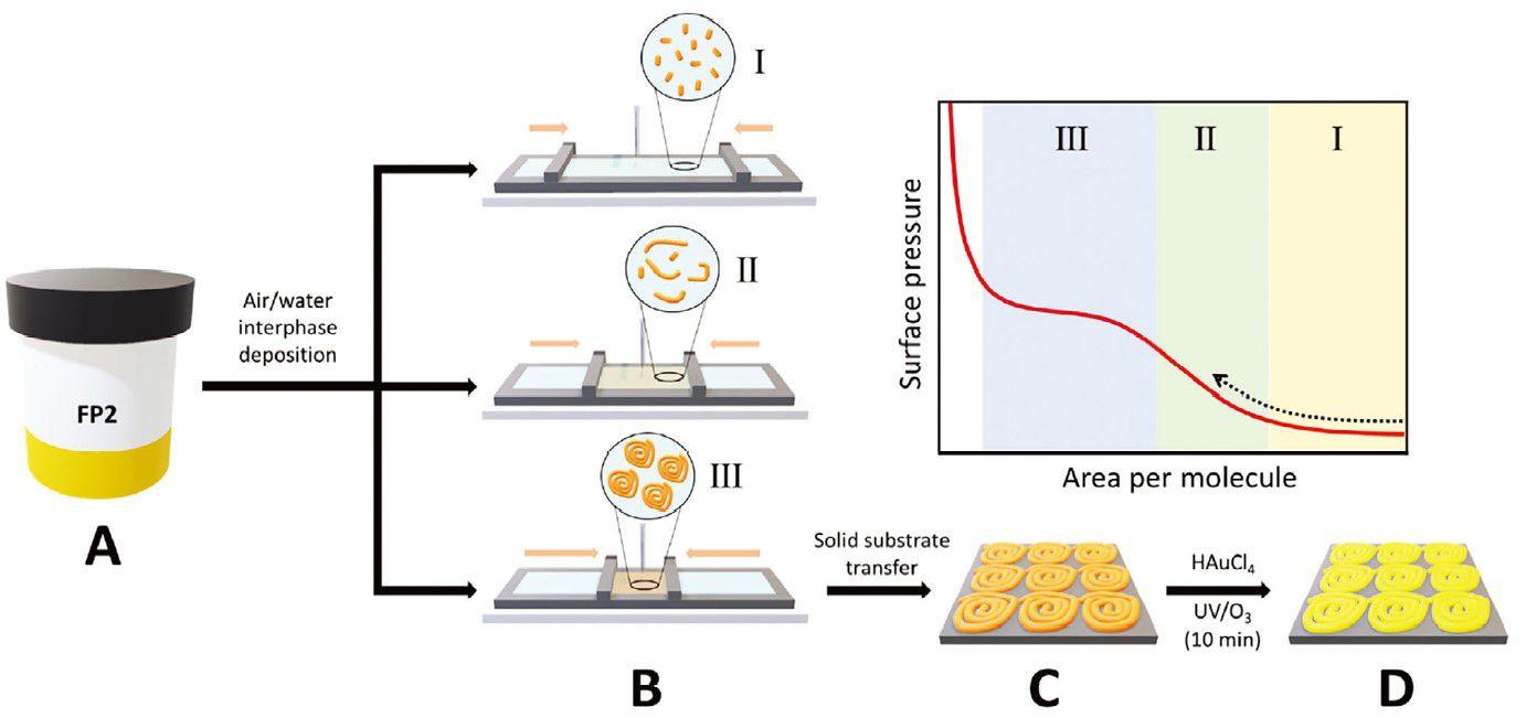 證明了病毒融合肽序列在朗繆爾槽內(nèi)從納米原纖維形成彈性螺旋狀結(jié)構(gòu)的卓越能力。此外通過控制空氣-水界面的壓縮力,獲得了具有特定曲率和纖維間距離的納米原纖維。單軸壓縮也證明了流體到固體的轉(zhuǎn)變,導(dǎo)致凝膠網(wǎng)絡(luò)的形成,如剪切流變學(xué)所證明的那樣。這里介紹的制造方法引入了單軸收縮方法,作為制造高度均勻的肽纖維單層并將其轉(zhuǎn)移到固體基質(zhì)上的穩(wěn)健而有效的方法。最后螺旋狀結(jié)構(gòu)用作制造金金屬復(fù)制品的模板。這種多技術(shù)方法不僅加深了對肽自組裝的理解,而且揭示了工程功能納米材料的新場景。
