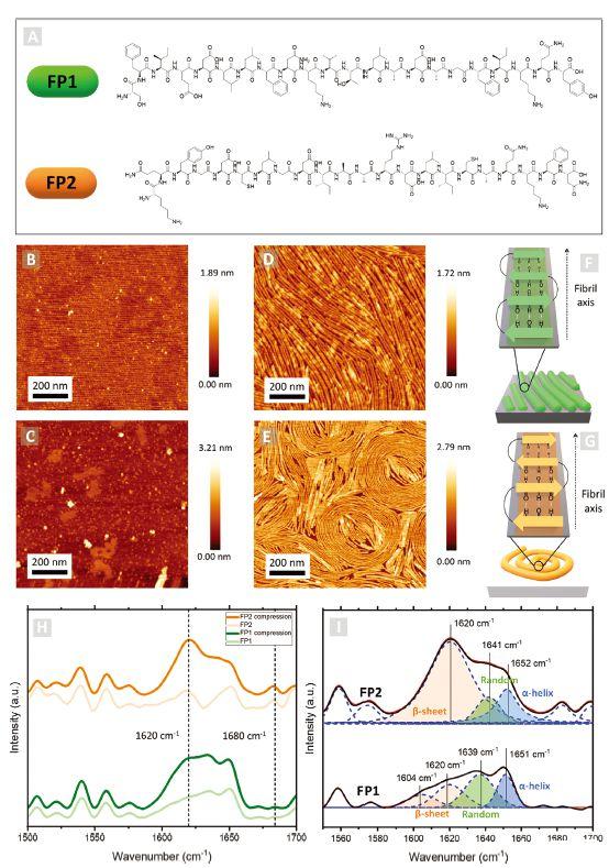圖2、A)FP1和FP2肽的化學(xué)結(jié)構(gòu)。FP1(B和D)和FP2(C和E)肽LB膜的AFM顯微照片分別在無壓縮(B和C)和20 mN m-1(D和E)的情況下轉(zhuǎn)移到新鮮切割的云母基底上。F,G)導(dǎo)致纖維形成的肽β-折疊二級結(jié)構(gòu)的示意圖。H)在這項(xiàng)工作中研究的樣品的LDIR光譜。I)將酰胺I帶解卷積為其主要成分。