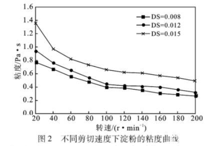 粘度是反映液體流變性能最常用的指標,粘度越小其流變性越高。由圖2可知,在同一轉(zhuǎn)速下,隨著取代度的增加,棕櫚酸酯淀粉糊液粘度升高;隨轉(zhuǎn)速增大,粘度先急劇下降后逐漸趨向平緩。棕櫚酸酯淀粉糊液粘度隨剪切速率的增大而減小,呈現(xiàn)“剪切稀化”特性,屬假塑性流體。淀粉糊液“剪切稀化”的程度與分子鏈的長短有關,高DS淀粉酯相對分子質(zhì)量較高,“剪切稀化”程度也較大。淀粉糊液表觀粘度隨著剪切速率的增大而降低,表明淀粉凝膠網(wǎng)絡體系中分子間或分子內(nèi)的作用力(氫鍵)在較高的剪切速率下更容易被破壞。當剪切速率繼續(xù)增加到淀粉分子纏結(jié)點、范德華力作用點被破壞完全來不及重建時,淀粉糊液表觀粘度趨于最小值。