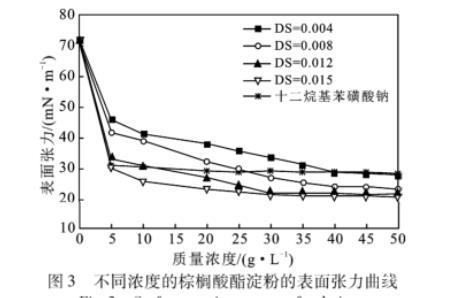 不同DS不同質(zhì)量濃度的棕櫚酸酯淀粉具有不同的表面張力,DS越高、質(zhì)量濃度越大,其表面張力越低,DS越高的淀粉其表面張力趨于穩(wěn)定的濃度越低,即臨界膠束濃度(cmc)越低。臨界膠束濃度(cmc)是表面活性劑的重要特征參數(shù),cmc越低的表面活性劑的效率越高。實驗范圍內(nèi)的棕櫚酸酯淀粉具有較高的表面活性,可作為表面活性劑應用。