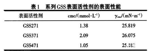 由表1可知,3種表面活性劑中GSS471的cmc較小,GSS271的cmc與之接近,GSS371的cmc最大。對(duì)于GSS371,由于連接基使兩條疏水鏈間的距離增大,導(dǎo)致疏水相互作用減弱,因而cmc較大;GSS371在表面定向排列疏松,在氣液界面置換的水分子較少,因此γcmc較大。連接基較短的GSS271,兩條疏水鏈距離較小,增強(qiáng)了疏水相互作用,cmc小;在表面排列較緊密致使γcmc較小。對(duì)于有較長(zhǎng)連接基的GSS471,由于連接基的柔性作用使連接鏈扭曲變形而導(dǎo)致兩條疏水鏈更靠近,化學(xué)鍵又使極性頭基被強(qiáng)制在較小的距離內(nèi),兩種因素均使GSS471疏水能力增強(qiáng)[15],分子更易聚集在一起,因而cmc小;同時(shí)在表面排列更緊密,因而γcmc最小。