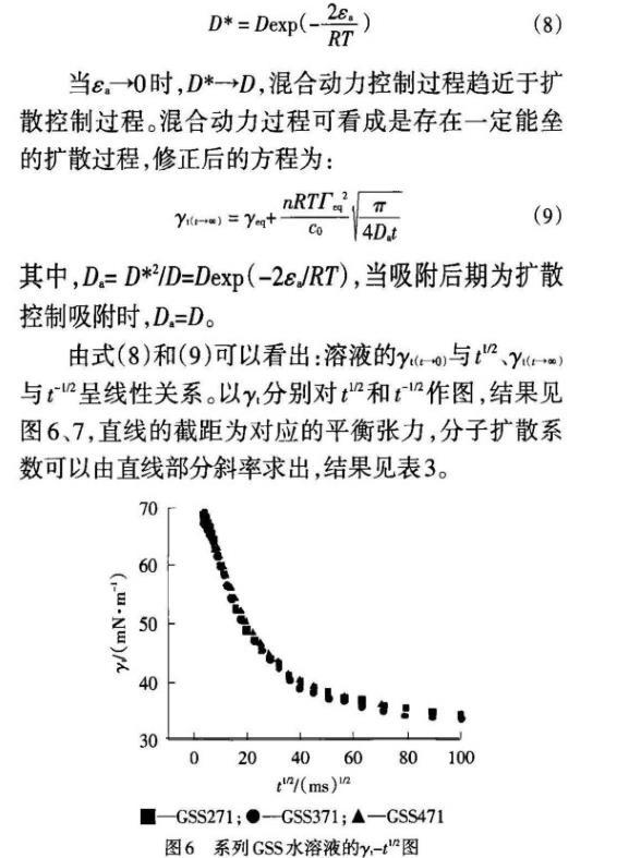 從表3可知,吸附初期GSS的擴(kuò)散系數(shù)較吸附后期大2~3個(gè)數(shù)量級(jí)。表明GSS分子自本體溶液擴(kuò)散到次表面的速度遠(yuǎn)大于在氣液界面與次表面之間的交換速度,因?yàn)樵谖匠跗冢╰→0),新鮮表面不存在吸附勢(shì)壘,屬擴(kuò)散控制吸附;吸附后期(t→∞),在氣液界面吸附的GSS分子由于相互作用產(chǎn)生的位能壘、離子頭基間的靜電斥力以及分子的定位重排等共同作用導(dǎo)致了混合動(dòng)力擴(kuò)散控制。