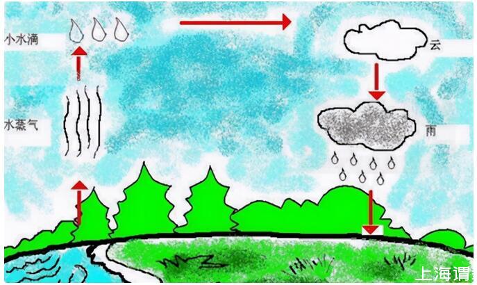 水(蒸發(fā))→水蒸氣(上升)→小水滴(凝固)→大水滴·云(溶合)→雨(下降)