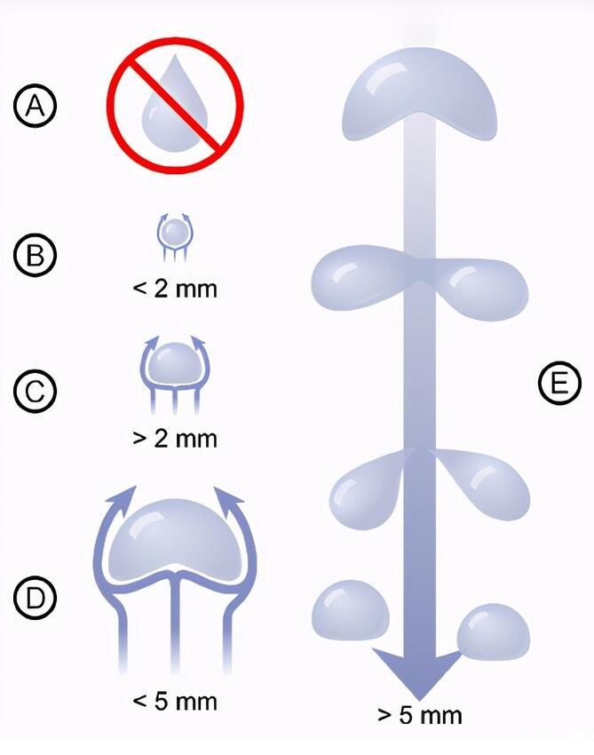 雨滴在被分割之前保持著的最大尺寸被稱作為「雨滴臨界破碎尺寸」,物理學(xué)則用「臨界半徑」來(lái)表示,在各種不同的氣流條件下,「雨滴臨界破碎尺寸」是不同的: