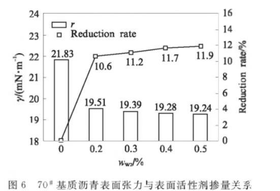使用改進差分毛細管法,得到不同表面活性劑摻量wW2下B+W2的表面張力值,見圖6.由圖6可見:未摻表面活性劑時,70#基質瀝青表面張力為21.83mN/m,表面活性劑摻量為0.2%時B+W2的表面張力為19.51mN/m,表面張力顯著降低,降幅為10.6%;表面活性劑摻量在0.3%——0.5%,表面張力在19.24——19.39mN/m,與70#基質瀝青相比,表面張力降幅趨緩,降低幅度為11.2%——11.9%.