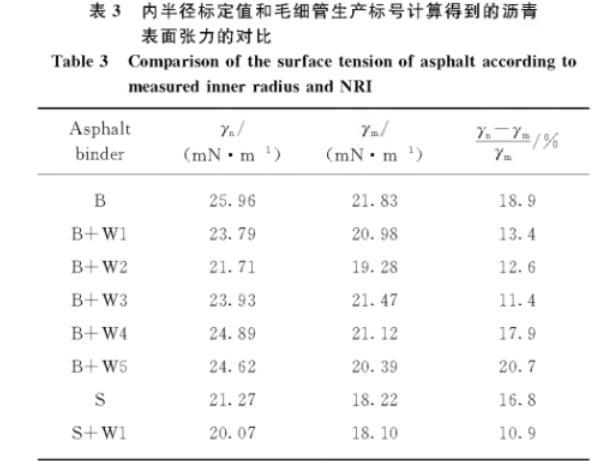 表3內半徑標定值和毛細管生產標號計算得到的瀝青表面張力的對比