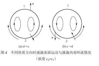 傳質(zhì)方向?qū)Ψ稚⑾鄿媛实挠绊懯怯捎贛arangoni效應(yīng)影響液滴破碎和聚并引起的。圖2和圖3中傳質(zhì)方向?yàn)閐→c的分散相滯存率遠(yuǎn)高于傳質(zhì)方向c→d的,原因在于本實(shí)驗(yàn)所用的正丁醇-丁二酸-水體系是界面張力隨濃度增加而減小的體系(即?γ/?c<0)。在?γ/?c<0體系的d→c傳質(zhì)過(guò)程中[如圖4(a)所示],界面張力梯度導(dǎo)致液滴表面的運(yùn)動(dòng)方向與液滴內(nèi)部環(huán)流方向相同,有利于液滴的破碎。而c→d的傳質(zhì)過(guò)程[如圖4(b)所示],界面張力梯度的方向不變,但液滴內(nèi)部環(huán)流方向卻恰好相反,內(nèi)部與外部?jī)煞N力量相互抵消,液滴相對(duì)較穩(wěn)定,破碎的概率大大減小。所以,d→c的分散相滯存率明顯高于相反方向。