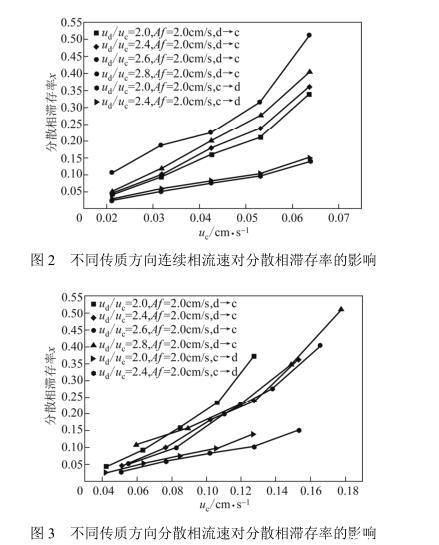圖2和圖3給出了不同的傳質(zhì)方向,分散相滯存率隨著連續(xù)相和分散相流速增加的變化情況。從圖中可以看出,流速的增加會(huì)使分散相滯存率增加。圖2中相比L大的分散相滯存率更大,這是由于連續(xù)相流速相同時(shí),相比較大,分散相流速就大,流速的增加會(huì)加劇流體的湍動(dòng),促進(jìn)液滴破碎,故而分散相滯存率增大。而圖3中,分散相滯存率的變化趨勢(shì)發(fā)生變化,對(duì)于傳質(zhì)方向由分散相到連續(xù)相(d→c),當(dāng)ud<0.08 cm/s時(shí),x(L=2.8)>x(L=2.0)>x(L=2.4)>x(L=2.6);當(dāng)ud>0.08 cm/s時(shí),x(L=2.0)>x(L=2.8)>x(L=2.4)>x(L=2.6)。這是由于當(dāng)分散相流速一定時(shí),相比越大意味著連續(xù)相流速越小,流體湍動(dòng)程度越小,分散相滯存率相應(yīng)會(huì)降低,因此在分散相流速大于0.08cm/s時(shí),相比2.8、2.6和2.4的分散相滯存率低于相比2.0。