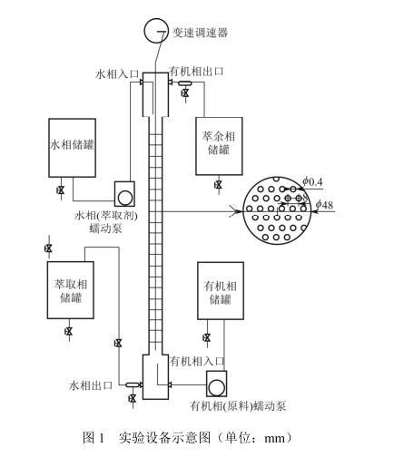水相和有機(jī)相分別通過(guò)可調(diào)節(jié)流速的蠕動(dòng)泵進(jìn)入塔內(nèi),兩相在塔內(nèi)實(shí)現(xiàn)逆流接觸傳質(zhì)后分別從塔底和塔頂?shù)某隹诹鞒鲞M(jìn)入各自儲(chǔ)罐。實(shí)驗(yàn)中溶質(zhì)丁二酸從有機(jī)相向水相傳遞,有機(jī)相和水相分別作分散相,以此來(lái)考察溶質(zhì)從分散相到連續(xù)相(d→c)和從連續(xù)相到分散相(c→d)不同傳質(zhì)方向?qū)腿⌒Ч挠绊憽?