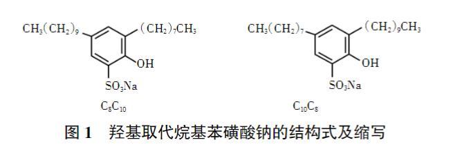 2-羥基-3-辛基-5-癸基苯磺酸鈉(C8C10OHphSO3Na)、2-羥基-3-癸基-5-辛基苯磺酸鈉(C10C8OHphSO3Na),均為實驗室自制,純度大于99%,臨界膠束濃度分別為3.35×10-6mol/L和1.35×10-6mol/L,分子結構如圖1所示;正癸烷,分析純,天津博迪化學有限公司產品;實驗用水為經重蒸后的去離子水,電阻率≥18 MΩ·cm。