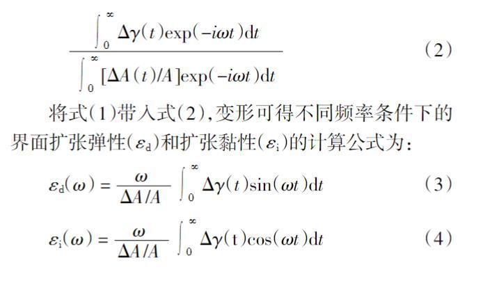 對于一個幅度為ΔA的瞬間界面形變過程,在形變停止后,在一定頻率(ω)下擴張頻率模量(ε)的數值可以通過對界面張力衰減曲線的Fourier變換得到,如式(2)所示: