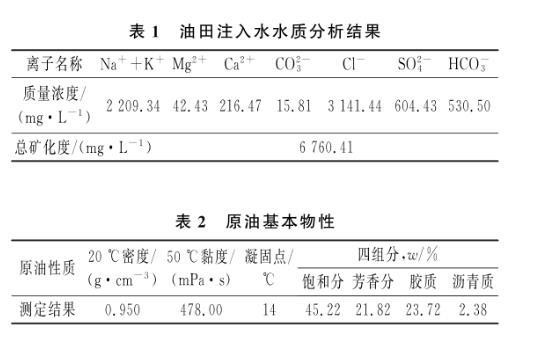 (1)主要材料。脂肪醇聚氧乙烯醚硫酸鈉、十二烷基苯磺酸鈉、十二烷基硫酸鈉,成都科龍化工試劑廠生產(chǎn);十六烷基二甲基甜菜堿、烷基糖苷APG1214,臨沂綠森化工有限公司生產(chǎn),上述藥品均為工業(yè)級(jí)。實(shí)驗(yàn)用水為油田注入水,水質(zhì)分析結(jié)果見(jiàn)表1;實(shí)驗(yàn)用油為X油田原油,其基本物性見(jiàn)表2。