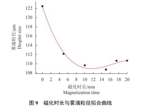 1)在0~500 mT磁場強度范圍內,當磁場強度為350 mT、磁化時間為15.0 min時,表面張力最小,為54.0 mN/m,下降14.96%;噴霧霧滴粒徑最小,為108.75μm,下降11.20%。溶液表面張力和噴霧霧滴粒徑隨磁場強度和磁化時長的增加均呈現先下降后回升的趨勢,表明只有在特定磁場強度和磁化時長范圍內磁化效果才最佳。