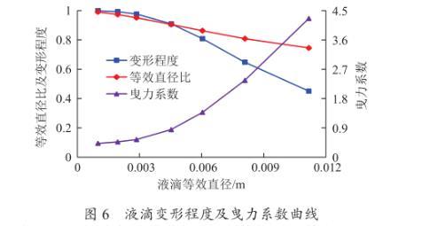 (2)液滴尺寸和液滴變形。如圖6所示為壓力15 MPa,溫度50℃時不同液滴尺寸下液滴變形程度、曳力系數的變化趨勢。從中可知,當液滴特別小時(1 mm),等效直徑比及變形程度系數接近1,曳力系數近似0.44,液滴呈球形基本不發生變形;隨著液滴尺寸從1 mm增大到10 mm時,等效直徑比從1減小到0.75,變形程度系數從1減小到0.45,曳力系數從0.44增大到4.3,液滴呈橢球形變形程度逐漸加大。