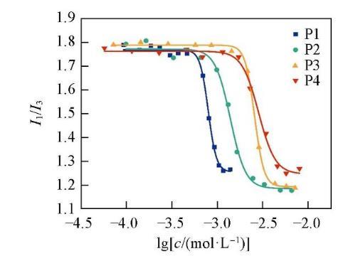 由圖3可見,當(dāng)表面活性劑的濃度較低時(shí),I1/I3在1.70——1.80之間波動(dòng);當(dāng)表面活性劑濃度逐漸增加至cmc時(shí),I1/I3值急劇下降,說(shuō)明表面活性劑分子開始形成膠束,使得芘分子轉(zhuǎn)移至疏水膠束內(nèi),芘分子所處的環(huán)境極性發(fā)生突變;在較高表面活性劑濃度下,I1/I3值趨于穩(wěn)定,這是由于芘分子已經(jīng)完全處于膠束中,所處的環(huán)境極性不再發(fā)生變化。通過(guò)Boltzmann方程擬合得到表面活性劑P1,P2,P3和P4的cmc值分別為7.96×10-4,1.39×10-3,2.57×10-3和2.85×10-3 mol/L。結(jié)果表明,隨著聚氧乙烯鏈長(zhǎng)度的增加,cmc逐漸增大。采用熒光法測(cè)得的cmc與采用表面張力法測(cè)得的cmc數(shù)值接近且變化趨勢(shì)一致。