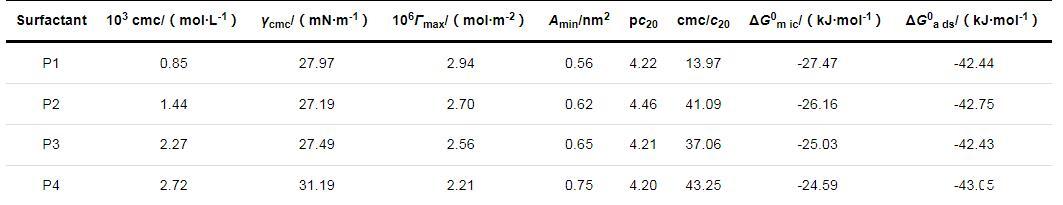 利用ΔG0a ds和ΔG0m ic表征表面活性劑的熱力學(xué)性質(zhì)。P1,P2,P3和P4的ΔG0a ds和ΔG0m ic均小于0,說(shuō)明表面活性劑在氣/液界面層上的吸附行為以及在水溶液中形成膠束的行為是自發(fā)進(jìn)行的。4種表面活性劑的ΔG0a ds均小于ΔG0m ic,表明表面活性劑分子在溶液中會(huì)先形成吸附層,當(dāng)氣/液界面吸附達(dá)到飽和狀態(tài)后才開始在溶液內(nèi)部形成膠束聚集體。