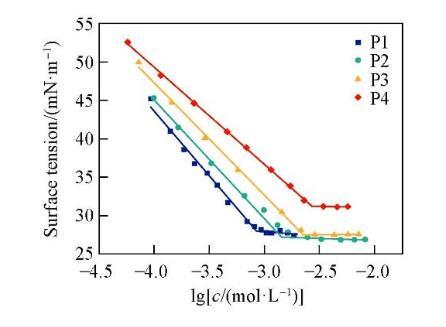 為研究4種非離子Gemini表面活性劑的表面活性,采用液滴體積法測(cè)定了不同濃度下的表面張力。圖2示出P1,P2,P3和P4的溶液表面張力與濃度對(duì)數(shù)的關(guān)系。溶液的表面張力隨濃度的增加而降低,當(dāng)溶液的濃度高于cmc后,表面張力達(dá)到最低值并基本趨于穩(wěn)定。這是由于隨著表面活性劑濃度的升高,在氣/液界面上吸附的表面活性劑分子數(shù)量增多,界面上的分子排列越來(lái)越緊密,表面張力持續(xù)下降;當(dāng)表面活性劑濃度達(dá)到cmc后,溶液內(nèi)部的分子開始聚集形成膠束聚集體,表面活性劑分子在界面上達(dá)到飽和吸附,因此cmc之后表面張力趨于穩(wěn)定。