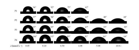 由圖2可知,P1,P2,P3和P4的cmc分別為8.51×10-4,1.44×10-3,2.27×10-3和2.72×10-3 mol/L;γcmc分別為27.97,27.19,27.49和31.19 mN/m.可見,隨著聚氧乙烯鏈長(zhǎng)度的增加,4種非離子Gemini表面活性劑的cmc逐漸增加,這是由于隨著聚氧乙烯鏈長(zhǎng)度的增加,表面活性劑的疏水作用減弱,不利于膠束的形成。γcmc隨著聚氧乙烯鏈長(zhǎng)度的增加先減小后增加,其中P2的γcmc最低,為27.19 mN/m,這可能是由于P2分子內(nèi)部的親水性和疏水性達(dá)到了平衡,能穩(wěn)定排列在氣/液界面上,降低表面張力的能力最強(qiáng)。P2,P3和P4的γcmc隨著聚氧乙烯鏈長(zhǎng)度的增加逐漸升高,這是由于親水性聚氧乙烯鏈長(zhǎng)度的增加使得表面活性劑分子在水溶液中卷曲程度增大,在界面處占據(jù)的空間增大,降低了分子在界面上的鋪展緊密度,從而導(dǎo)致γcmc升高。