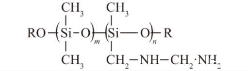 用電子天平稱取一定量的氨基酸和異丙醇并將二者攪拌混合在一起;將混合物加入到硅油化合物中,在氮氣的保護下,攪拌升溫至70℃,反應時間為5 h;最后進行減壓蒸除溶劑,得到改性后的氨基改性硅油。氨基改性硅油是一種有機硅聚合物,通過將含有氨基的有機化合物與含有硅鍵的有機硅化合物反應而得到。在反應過程中,氨基與硅烷發生縮合反應,生成氨基改性的有機硅油化合物。結構式如圖1所示。