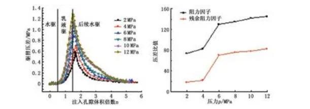 (3)隨著壓力的升高,阻力因子和殘余阻力因子均逐漸增加,在壓力由4 MPa升至8 MPa過程中,阻力因子大幅增加,壓力的升高使巖心封堵過程中的最高壓差提前出現。