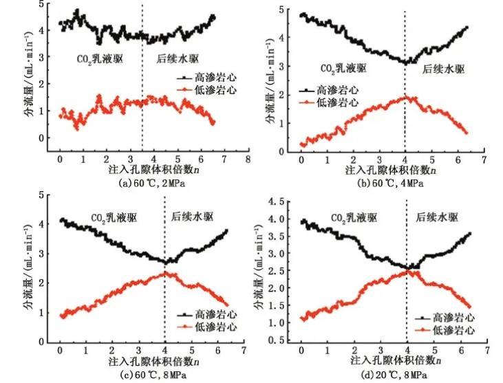 對比圖10(c)、(d),當溫度為20℃時,高滲巖心與低滲巖心出口端產液量基本持平;溫度升高至60℃后,低滲巖心的分流量從2.5 mL/min降至2.2 mL/min,說明溫度也是影響CO2乳液調剖分流效果的主要因素,應用CO2乳液的調剖分流時應考慮不同井深的溫度場對CO2乳液穩定性和有效期的影響。