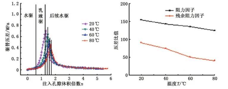 (2)溫度對AOT穩定的CO2乳液有一定的影響,隨著溫度的增加,驅替壓差降低,乳液驅替過程中的阻力因子有所降低,殘余阻力因子也隨之降低;低溫下的CO2乳液向儲層內流體的擴散效果更弱,擁有更高的界面黏彈性和更大的機械強度,在巖心驅替過程中可以更好地封堵地層,也更早實現高強度封堵。