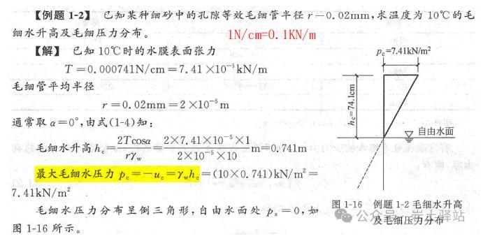 來(lái)自《土力學(xué)》式中,水膜張力T與溫度有關(guān),單位:N/cm或KN/m;10°時(shí),T=7.41×10-4N/cm=7.41×10-5KN/m;方向與毛細(xì)管成夾角α,該角度的大小與土顆粒礦物成分和水性質(zhì)有關(guān);