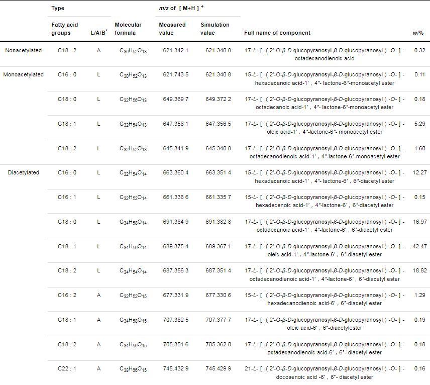 表2去乙酰化SLs同系物組分和質量分數(Continued from previous page)