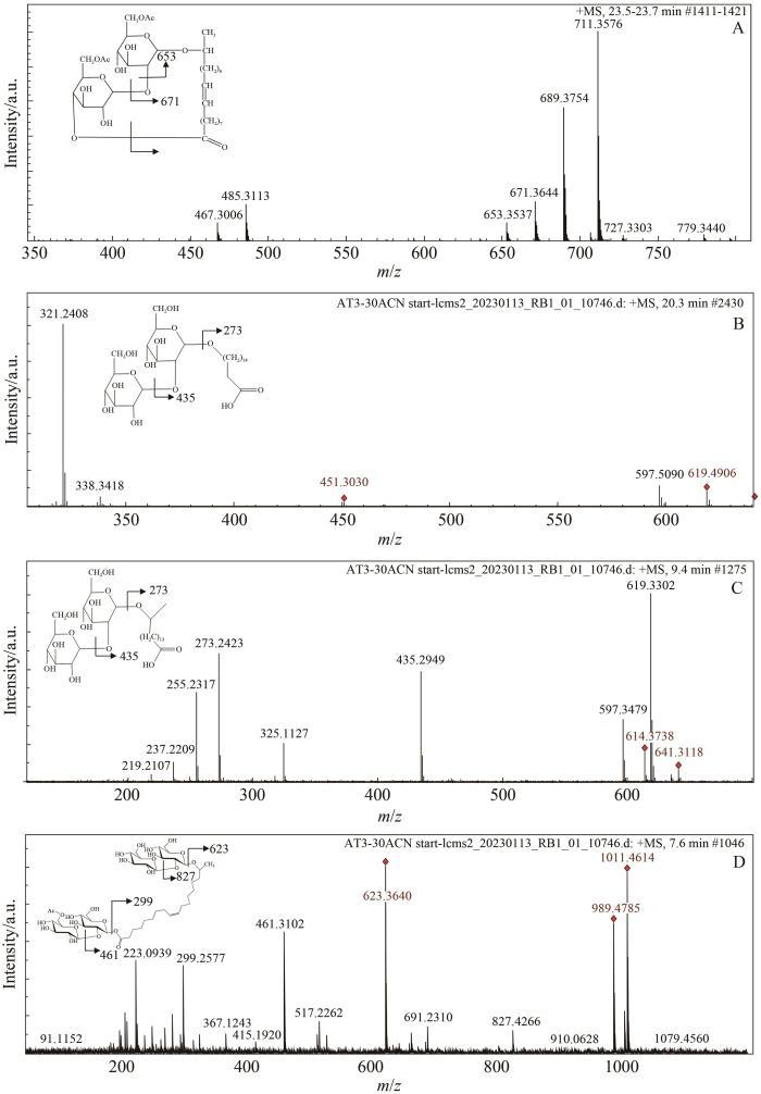 圖2(A)乙?;疭Ls保留時間為23.6 min組分的質譜圖.(B)去乙?;疭Ls保留時間為20.3 min組分的質譜圖.(C)去乙酰化SLs保留時間為9.4 min組分的質譜圖.(D)去乙?;疭Ls保留時間為7.6 min組分的質譜圖