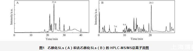2類SLs同系物HPLC-MS/MS鑒定結果表明,乙?;疭Ls含有14種同系物(圖1A),去乙酰化SLs具有16種同系物(圖1B)。
