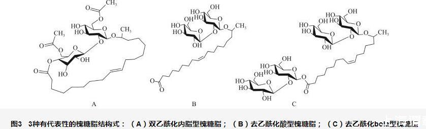 圖3 3種有代表性的槐糖脂結構式:(A)雙乙酰化內脂型槐糖脂;(B)去乙?;嵝突碧侵唬–)去乙?;痓ola型槐糖脂