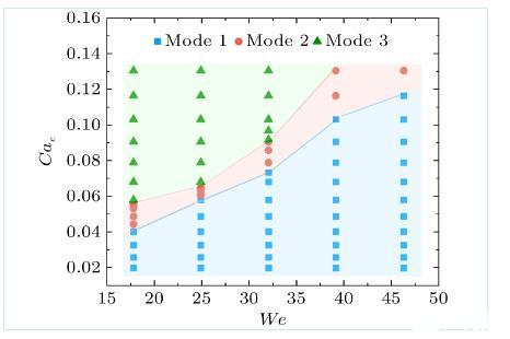 液滴撞擊韋伯數可以顯著影響液滴的動力學行為,尤其是鋪展與拉伸過程,且在外加電場力的作用下必會進一步加深對液滴撞擊行為的影響。本文研究對象為低韋伯數,在此范圍內,液滴的動態行為涵蓋鋪展、回縮、拉伸及振蕩。通過對不同韋伯數下液滴撞擊行為的實驗數據分析表明:在相同的電場強度下,隨著液滴韋伯數的增大,液滴產生的模態呈現出顯著差異,如圖5所示。具體而言,當電場強度維持在較高狀況且保持一致時,撞擊We的增加導致液滴的拉伸高度明顯減小,同時液滴模態從第三種模態逐步過渡到第二種模態,并最終轉變為第一種模態。