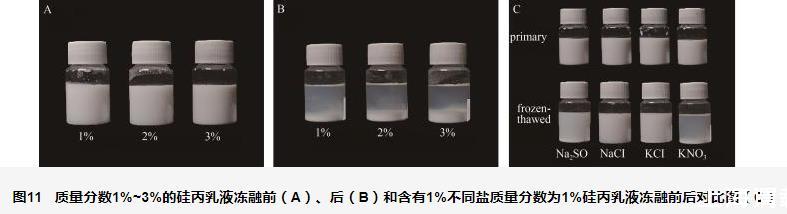 圖11質量分數1%~3%的硅丙乳液凍融前(A)、后(B)和含有1%不同鹽質量分數為1%硅丙乳液凍融前后對比圖(C)