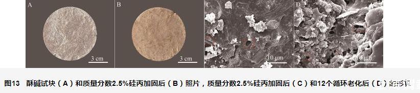 圖13酥堿試塊(A)和質量分數2.5%硅丙加固后(B)照片,質量分數2.5%硅丙加固后(C)和12個循環老化后(D)的形貌