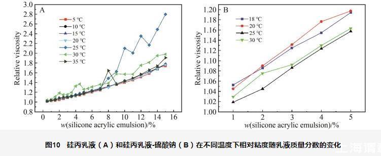 圖10硅丙乳液(A)和硅丙乳液-硫酸鈉(B)在不同溫度下相對粘度隨乳液質量分數的變化