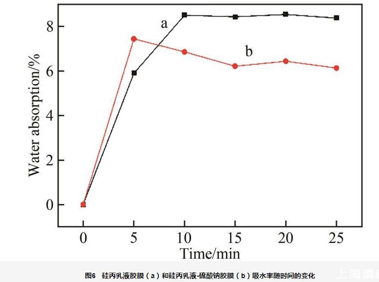 圖6研究了硅丙乳液膠膜和硅丙乳液-硫酸鈉膠膜的吸水率,可以看出,隨時間增加,硅丙乳液的吸水率也逐漸增大,造成這種現象的原因是硅丙乳液分子結構中的―OH和―COOH遇到水分子時形成氫鍵,在范德華力和氫鍵作用下,膠膜表現出一定的吸水性。另外,從圖6還可看出,硫酸鈉膠膜的吸水率較小,這是因為膠膜網絡結構中的硫酸鈉在水中完全電離,膠膜三維網絡結構中的Na+對膠膜中的―COO-產生電荷屏蔽效應,使膠膜三維網絡結構內外溶液的滲透壓差降低。同時,外部溶液中的Na+與網絡結構中的―COO-發生“離子交聯”,導致膠膜網絡結構中有效交聯密度增大,吸水率下降。