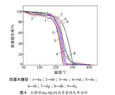 圖9所示為熱質量損失結果。從圖9可見:烷基吡喃木糖苷6a~6i均只有1個質量損失臺階,起始分解溫度分別為157.9,177.3,172.6,162.3,164.1,169.5,151.7,170.4和208.9℃左右,最大分解速率時的溫度依次為283.2,287.8,296.6,257.9,290.4,286.1,301.9,262.7和339.8℃。糖苷6a~6i熱分解完時的溫度分別為303.1,298.1,329.6,365.5,320.4,340.2,332.0,374.6和356.2℃。總質量損失率為94.9%,89.9%,91.0%,91.9%,95.3%,96.6%,89.6%,88.5%和91.5%。結果表明:合成的烷基吡喃木糖苷在150℃以下是穩定的。
