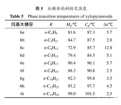 具有液晶特征的化合物因加熱而呈現所謂的“雙熔融轉變”的相變現象,當加熱達到其熔點(p)時,結晶性的固態首先轉變成半透明的液晶態,接著在較高的溫度(p)下轉變成各向同性的清亮的液態。表5所示為木糖苷的相轉變溫度。從表5可見:烷基-β-D-吡喃木糖苷屬于一頭一尾(one head one tail)或一頭組一鏈(one head group-one chain)且呈現多態性的雙親吡喃糖苷分子,在加熱時其相變發生在相對較小的溫度區間,但都出現了液晶相,且當疏水性烷基碳鏈長度為6時,烷基-β-D-吡喃木糖苷相變溫度之差(Δ)較大,其他的都比較接近。在木糖苷中,烷基有助于提升分子取向的穩定性,且這種穩定性對液晶相的生成是必要的。但由于烷基-β-D-吡喃木糖苷為環狀的糖苷只有3個游離羥基,比烷基--D-吡喃葡萄糖苷少了親水性頭部的糖環上的羥甲基,也比木糖醇的十二烷基單醚少了1個游離的羥基,清亮點p不高,所以,得到的烷基-β-D-吡喃木糖苷具有液晶相,但相變溫度范圍(?=p?p)較窄,液晶相的穩定性較弱。