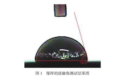 圖1為本實驗所選煤樣的接觸角測試結果圖,由圖可以看出,煤樣的接觸角為74.2°,相較于其他類型的煤(接觸角為20.55°,22.34°,34.23°和29.75°),其接觸角明顯偏大,具有較強的疏水性。