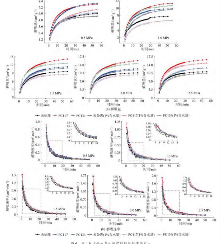 通過對干燥與含水煤樣解吸量和解吸速率的分析,經過氣潤濕反轉劑——FC117和FC134處理后的煤樣解吸量和解吸速率均有所提升,其中FC117的效果更加顯著。同時,經過表面活性劑處理后,煤樣的潤濕性發生轉變,水鎖效應得到緩解和消除。含水煤樣的解吸量和解吸速率也均大于未處理的干燥煤樣。定量地分析了表面活性劑改變煤體表面潤濕性,由親水性向疏水性轉變,緩解水鎖損害,進而增加煤樣解吸量。