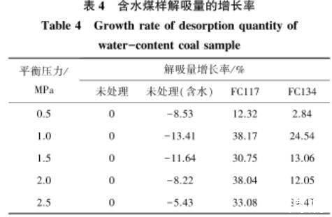 4)對經過FC117和FC134處理后的干燥/含水煤樣進行解吸量和解吸速率的測定,兩種表面活性劑處理后煤樣的解吸效果均有顯著的效果。在氣潤濕反轉劑處理后的煤樣吸附量小于未處理的,而解吸量和解吸速率大于未處理的,則表明氣潤濕反轉劑處理后的煤樣可以消除水鎖效應,增加解吸率,提高解吸效果。
