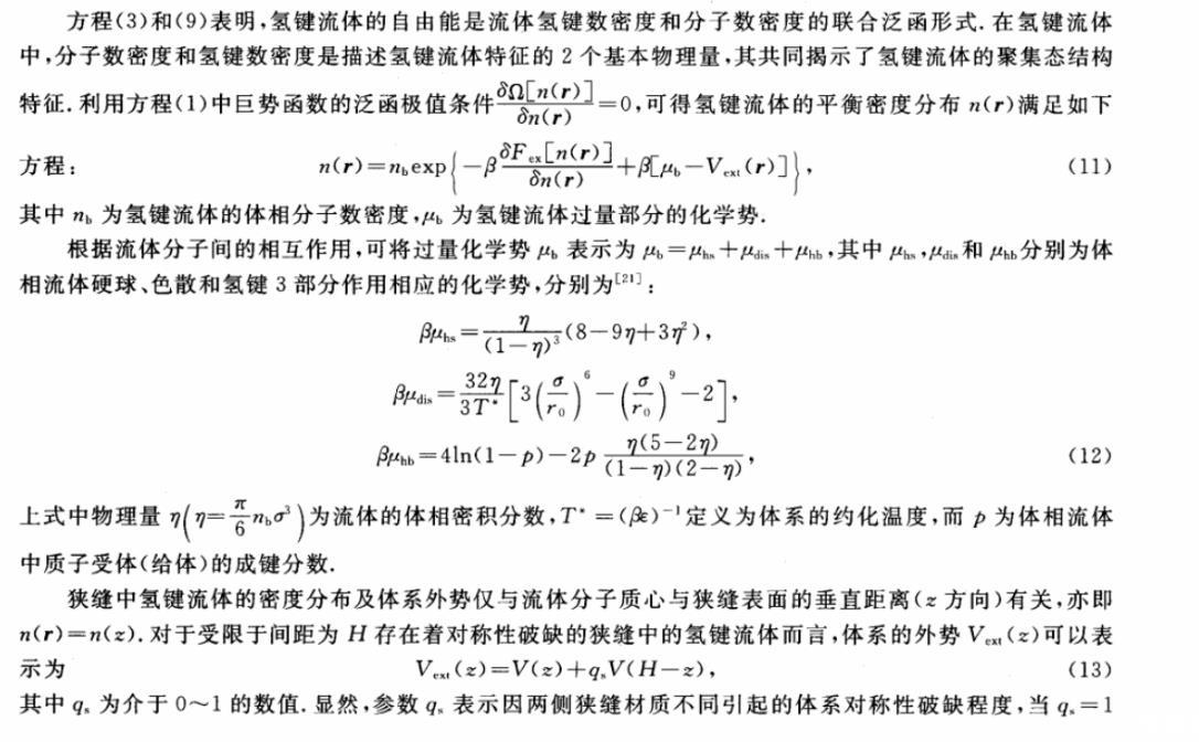 其中nb為氫鍵流體的體相分子數(shù)密度,μb為氫鍵流體過(guò)量部分的化學(xué)勢(shì)。