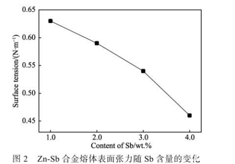 1)Sb的添加能顯著降低鋅液表面張力,且合金熔體表面張力隨Sb含量的增大而減小。當Sb質量分數為1.0%時,鋅合金熔體表面張力為0.63 N/m;Sb質量分數增加到4.0%時,表面張力達到最小,約為0.46 N/m。