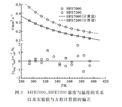 圖3給出了HFE7000、HFE7200黏度與溫度的關系以及實驗值與擬合方程計算值的偏差,結果表明,實驗值與方程計算值的偏差均在±2%之內。
