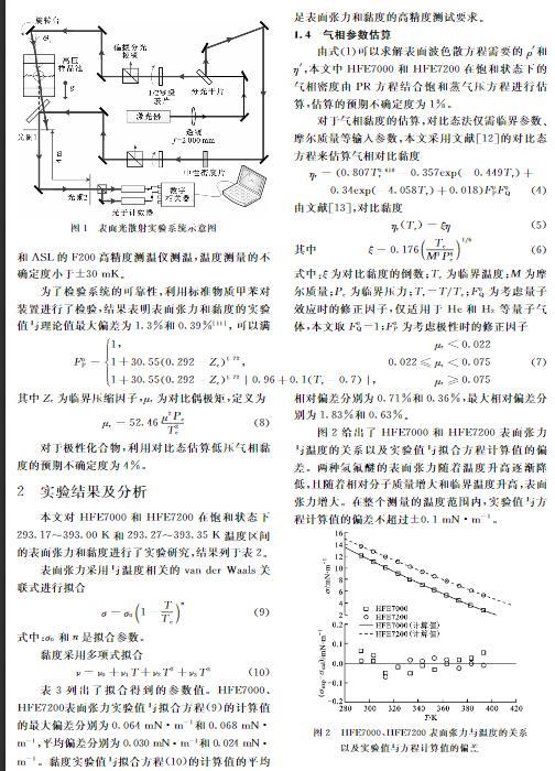 本文利用新搭建的表面光散射實驗系統(tǒng)測量了兩種氫氟醚類物質HFE7000和HFE7200在飽和狀態(tài)下的表面張力和黏度,溫度范圍均為293~393 K。利用獲得的數(shù)據(jù),擬合了表面張力和黏度的關聯(lián)式。HFE7000和HFE7200表面張力實驗值與關聯(lián)式計算值的平均偏差分別為0.030 mN·m-1和0.024 mN·m-1;HFE7000和HFE7200黏度實驗值與關聯(lián)式計算值的平均相對偏差分別為0.71%和0.36%。