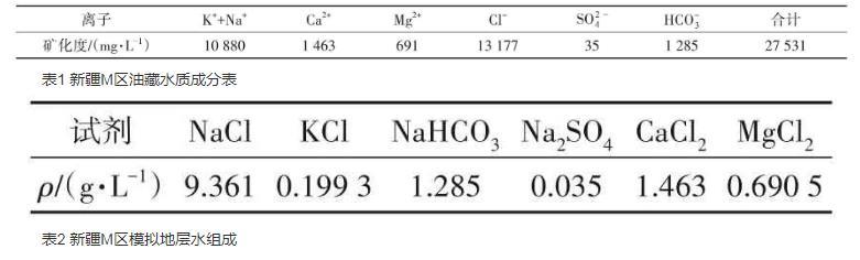 油藏水質成分見表1,模擬地層水組成如表2所示。