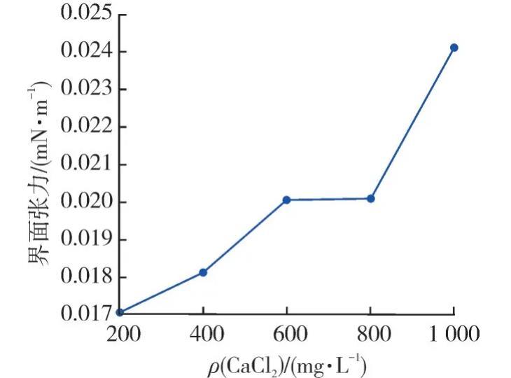 由圖4和5可知:隨著Na+濃度的增加,復配體系的油水界面張力值雖然不斷上升,但是當礦化度上升至50 000 mg/L時,界面張力值增幅很小,僅增加了0.008 mN/m。當Ca2+質量濃度增加至1 000 mg/L時,界面張力值增幅也很小,僅上升了0.007 mN/m。這兩種現象證明了隨著礦化度的增加,復配體系仍然具有較好的抗鹽性能,這也正是非離子表面活性劑的特點。