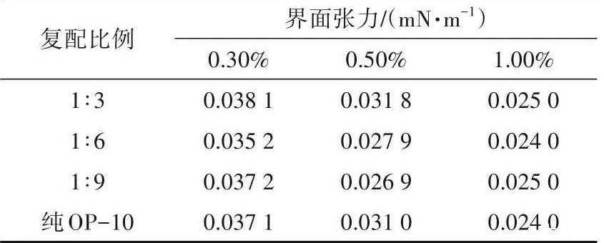 將HPAM配制成質量分數為0.10%的水溶液,與不同濃度的OP-10按不同比例復配,并測定不同復配體系的界面活性,結果見表3。